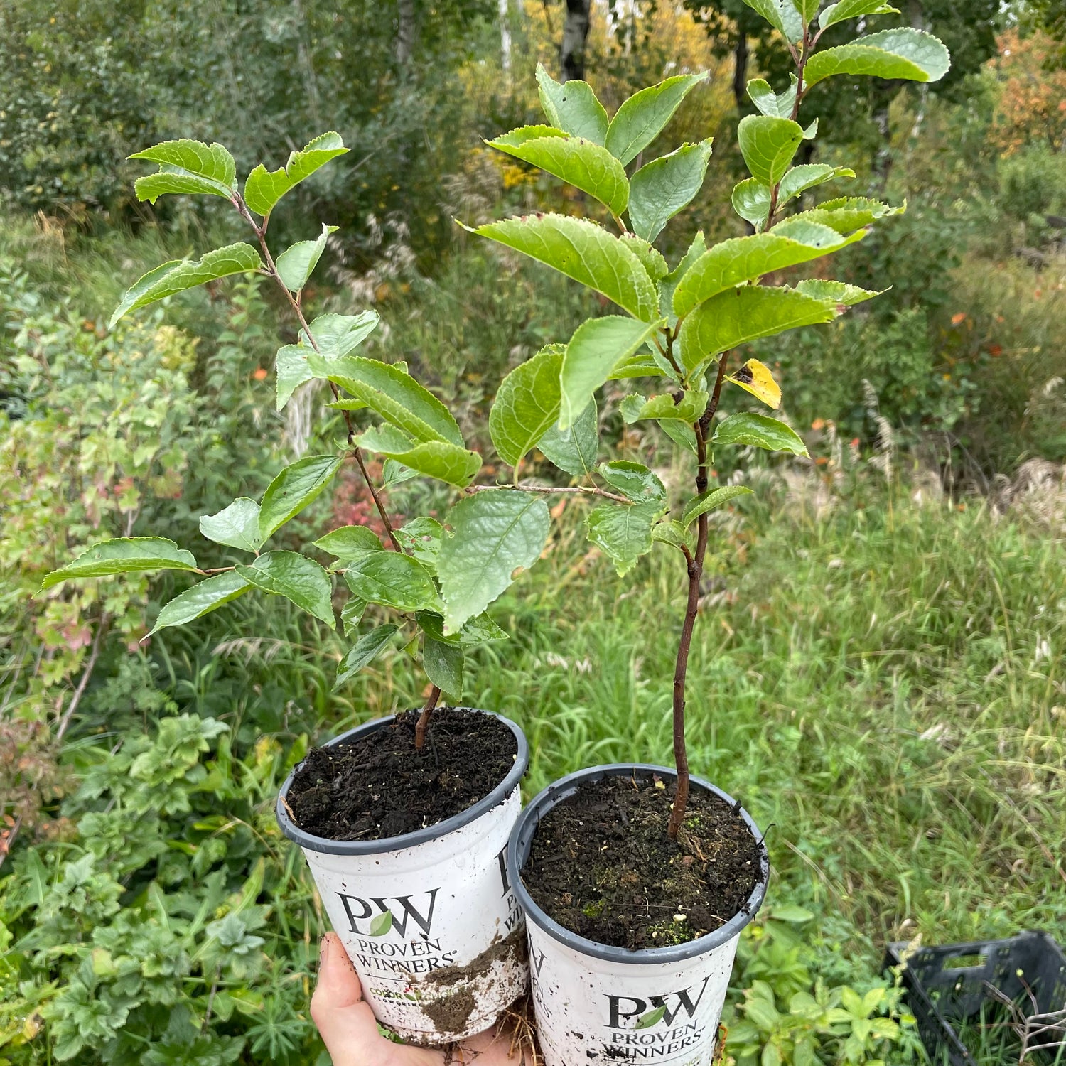 A group of apple grafts made in spring of 2022 onto wild Saskatoon trees near the nursery. We had some unexpected pruning by a curious rabbit in 2024, but after adding wildlife protection these bounced back and fruited in 2025 with a crop of September Ruby apples. We've been experimenting with apple, pear and plum graft compatibility onto our wild native fruit trees, with the benefit that they're perfectly adapted to our cold climate and sandy soil. These unconventional rootstocks are a fun grafting experiment with surprisingly good results. We have a few blog articles below about our ongoing field trials.