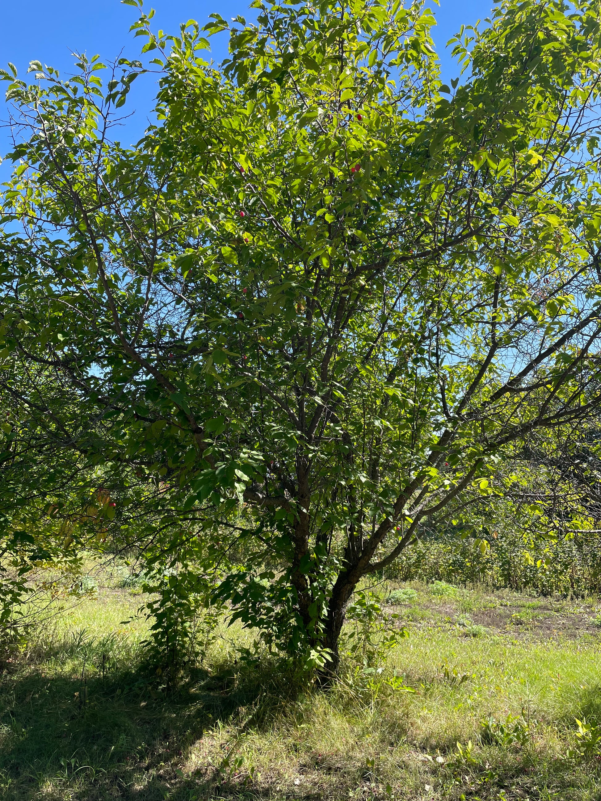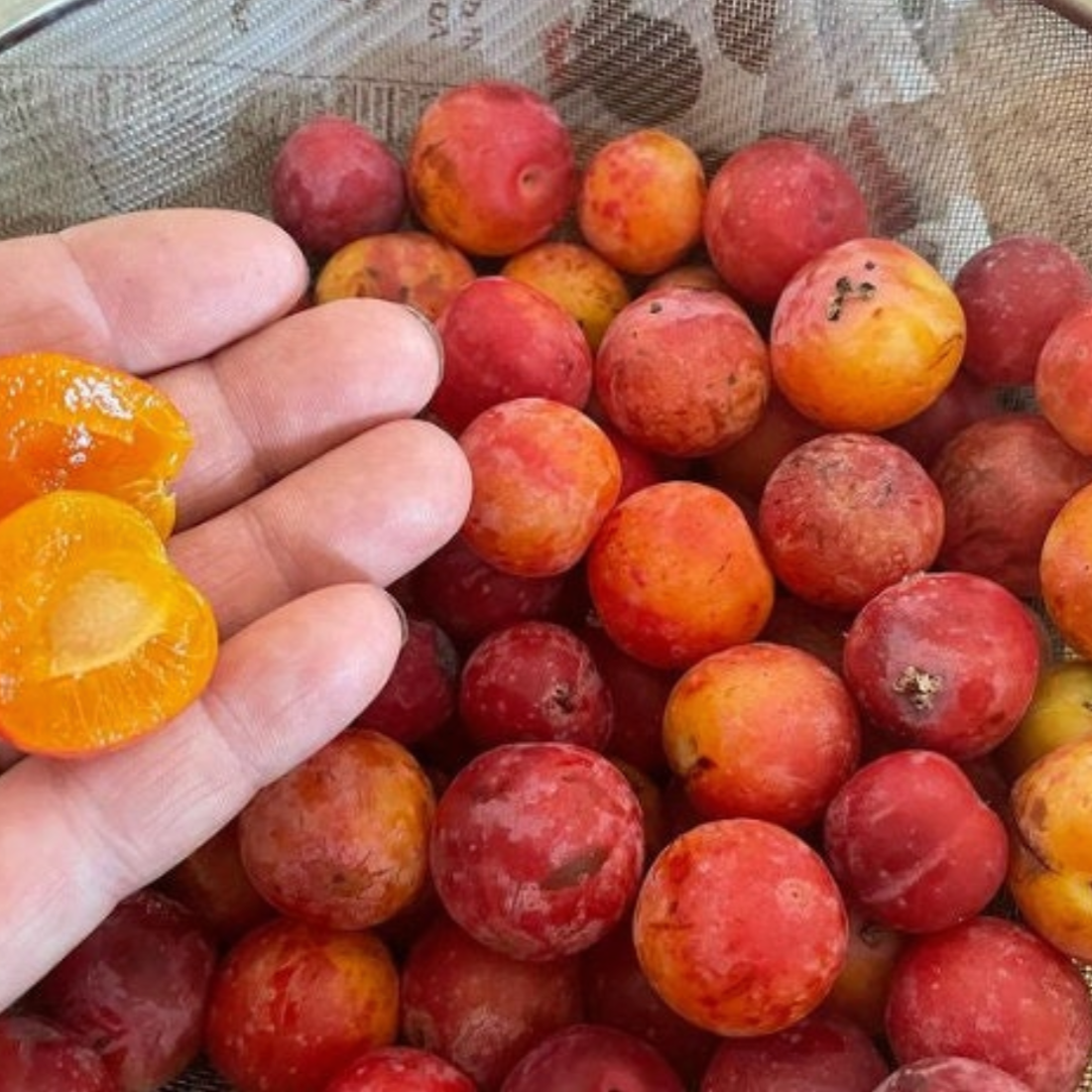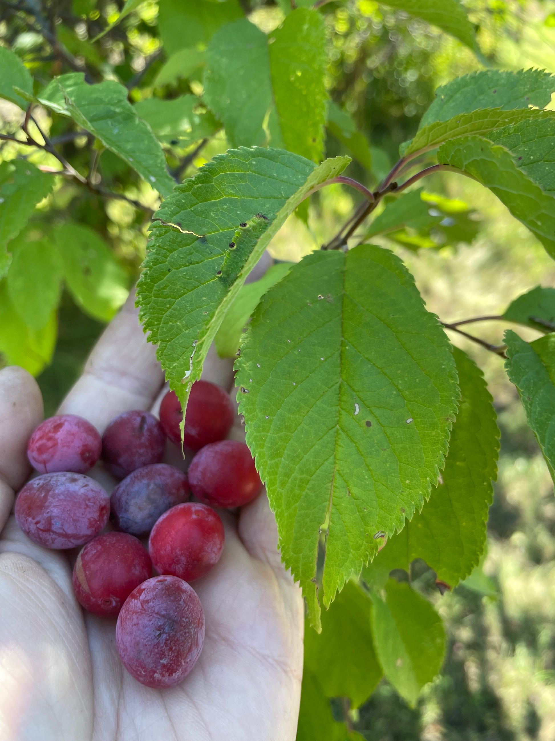 Le prunier d'Amérique est un arbre fruitier polyvalent et résistant au froid qui produit de petites prunes rondes au goût acidulé et sucré. La couleur des fruits varie du jaune au rouge foncé à maturité et ils sont bons à manger frais ou à faire des confitures et des gelées. Les prunes sauvages ont une génétique diversifiée et mesurent entre 5/8 et 1 pouce et sont mûres ici fin août. Les arbres sont résistants au froid et ont une certaine valeur ornementale avec beaucoup de fleurs blanches au printemps, et ils sont un excellent pollinisateur pour d'autres prunes. Si vous avez un prunier cultivar, ajouter quelques prunes sauvages améliorera la pollinisation et vous donnera une meilleure récolte. Ils aiment pousser comme un arbuste à plusieurs tiges ou un petit arbre. Ils poussent mieux en plein soleil. Excellent comme pollinisateur, nourriture pour la faune et les humains, et nous les cultivons comme porte-greffes dans notre pépinière pour greffer sur de nombreux cultivars de pruniers.
