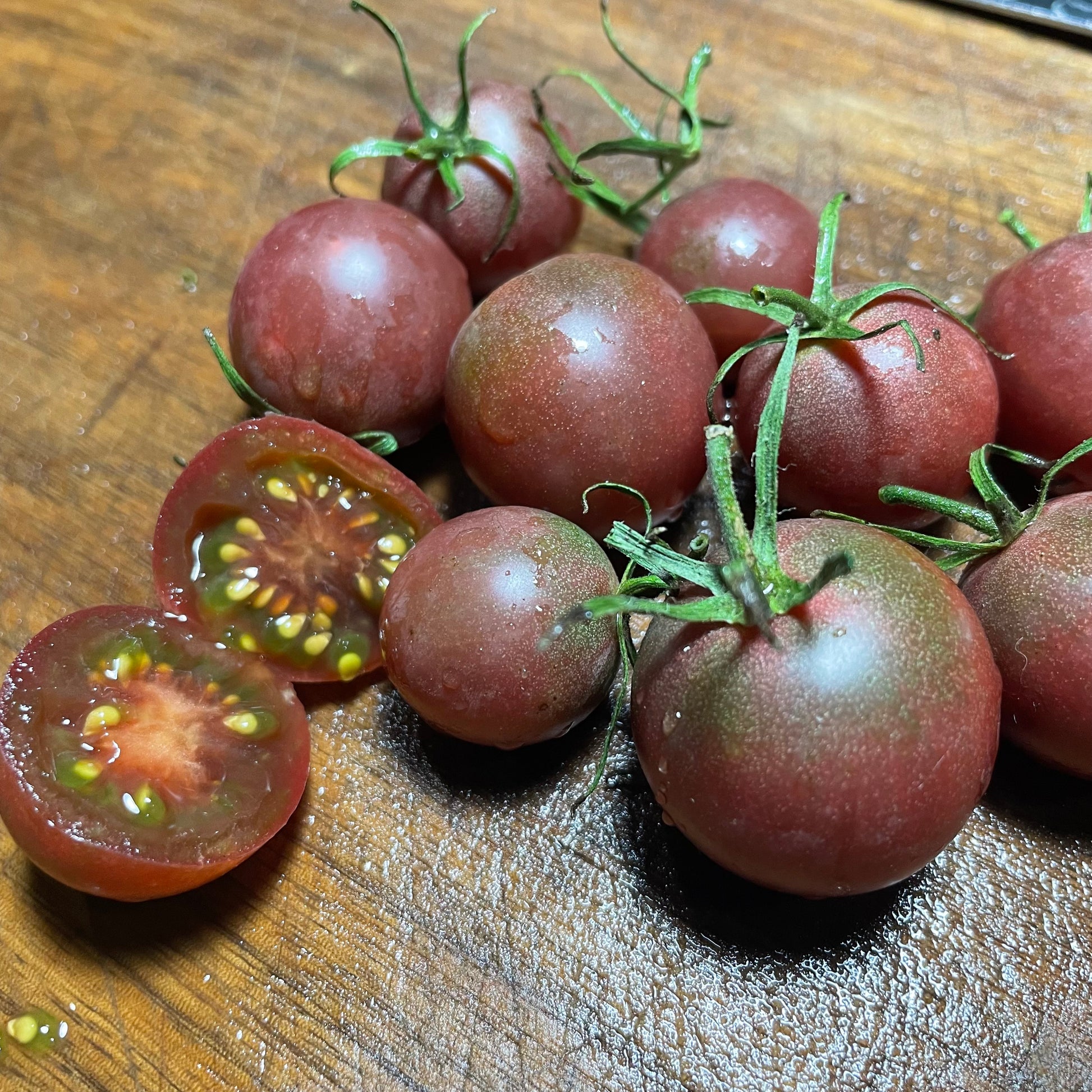 La tomate cerise noire est une variété de tomate cerise unique, connue pour sa peau brun-violet foncé et sa saveur riche et complexe. Chaque fruit mesure environ 2,5 cm de diamètre et pousse en grappes prolifiques au goût juteux, sucré et légèrement fumé. Maturité en 65 à 75 jours, cette variété est appréciée pour ajouter de la couleur et de la profondeur aux salades, aux aliments frais et aux garnitures.