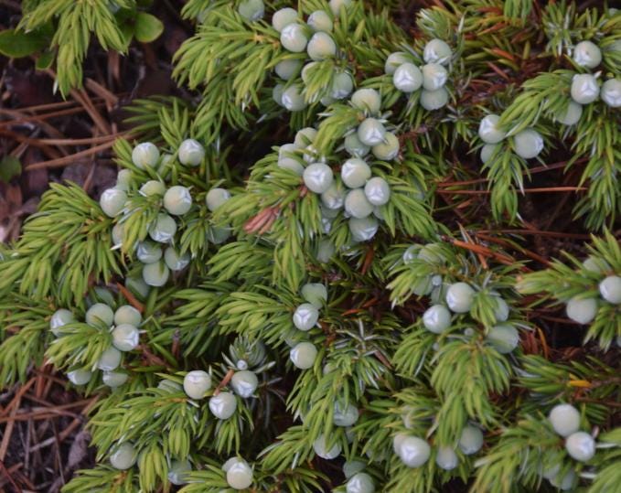 Widespread evergreen shrub or small tree native across the northern hemisphere, including Canada. Growth habit varies from low spreading mats to upright bushes depending on the form. Needles are short, sharp, and in whorls of three, giving the plant a spiny texture. Female plants produce berry like cones that ripen from green to bluish black and are aromatic. These cones are the traditional flavouring for gin and are also eaten by wildlife. Extremely cold hardy and tolerant of poor soils, drought, and exposed sites. Often used in naturalized plantings, rock gardens, and for soil stabilization on sandy or rocky ground.