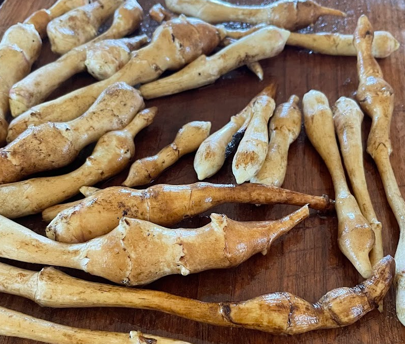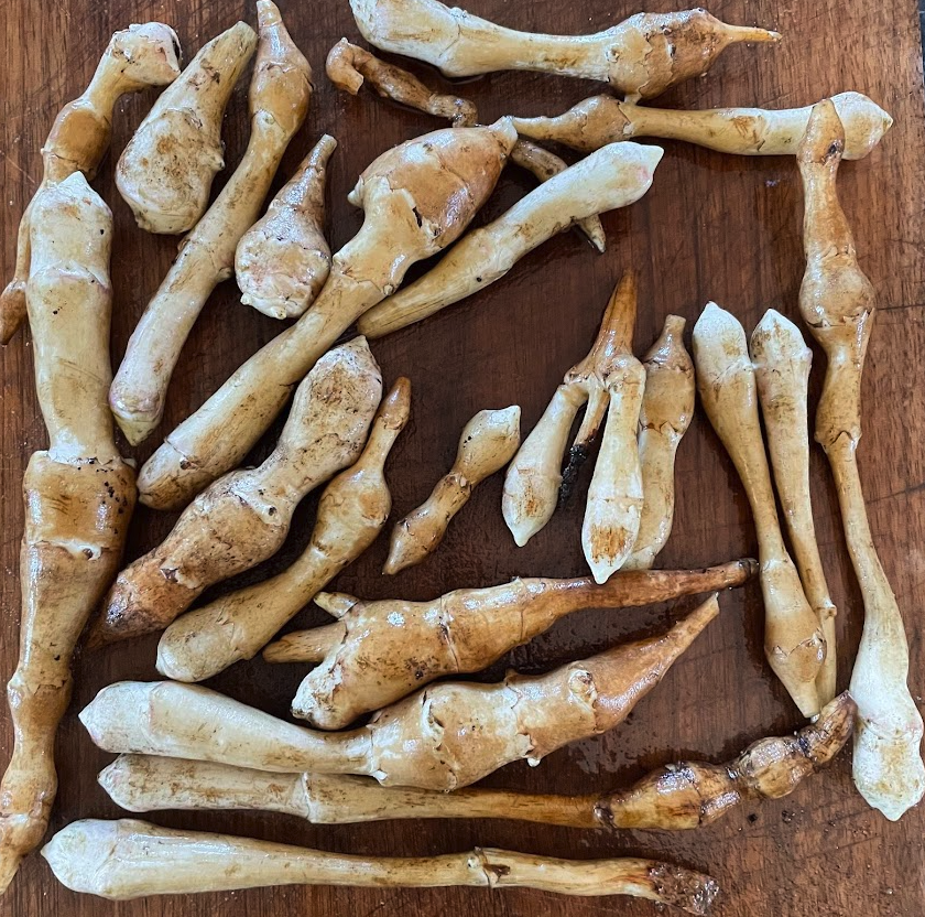 Nous avons des tubercules de topinambour frais disponibles pour expédition au Canada. Il s'agit d'une variété violette. Vous obtenez une poignée de 5 tubercules de tailles assorties dans un seul paquet.