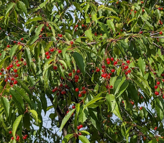 Le cerisier de Pennsylvanie est un petit arbre à feuilles caduques à croissance rapide, atteignant une hauteur de 15 à 30 pieds et une largeur de 10 à 15 pieds. Connu pour ses grappes attrayantes de fleurs blanches au printemps, il produit des cerises acidulées rouge vif au milieu de l'été, appréciées des oiseaux et de la faune. L'arbre a une couronne étroite et arrondie et une écorce lisse brun rougeâtre. Ses feuilles sont lancéolées, devenant jaune vif à l'automne. Localement, nos cerisiers de Pennsylvanie sont mûrs de la mi-juillet à la fin juillet.