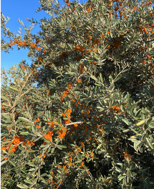 Le fruit est comestible et fait une excellente gelée, il a un goût sucré et acidulé. C'est un excellent arbre faunique. Semblable à l'argousier mais avec des feuilles plus petites et plus rondes et le fruit est rouge, il pousse en grappes le long des tiges. C'est un fixateur d'azote. Les arbres sont dioïques, ce qui signifie qu’il existe des plantes mâles et femelles – vous avez besoin des deux pour produire des fruits.