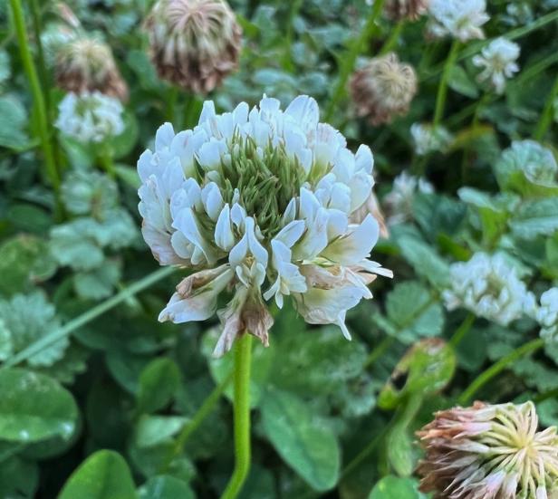 Le trèfle blanc est une plante herbacée vivace à croissance lente originaire d'Europe et d'Asie centrale, mais largement naturalisée en Amérique du Nord. Atteignant une hauteur de 20 à 30 cm, cette plante présente des feuilles trifoliées et produit de petites têtes de fleurs blanches à blanc rosé du printemps à l'automne. Il prospère dans une variété de types de sols, préférant les sols limoneux bien drainés et peut tolérer à la fois le plein soleil et l'ombre partielle. Le trèfle blanc est couramment utilisé comme couvre-sol ou dans les pelouses en raison de sa capacité de fixation de l'azote, qui enrichit le sol. Ses fleurs attirent les abeilles et autres pollinisateurs, ce qui en fait une plante précieuse pour le maintien de la biodiversité des jardins. Dans les jardins canadiens, le trèfle blanc est apprécié pour sa robustesse et sa capacité à améliorer la santé du sol.